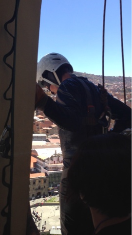 We tried some rappelling when we got here, which someone mentioned to us during our last stop in Peru. I guess I'd always passively wondered what it was like to scale an actual building, and so Thursday we got that chance - from 17 stories and in full costume, no less. Sandy took me golfing yesterday for my birthday, to the course known as boasting the highest altitude in the world (yes, it did wonders for the distance off the tee). I could think of no better birthday gift.